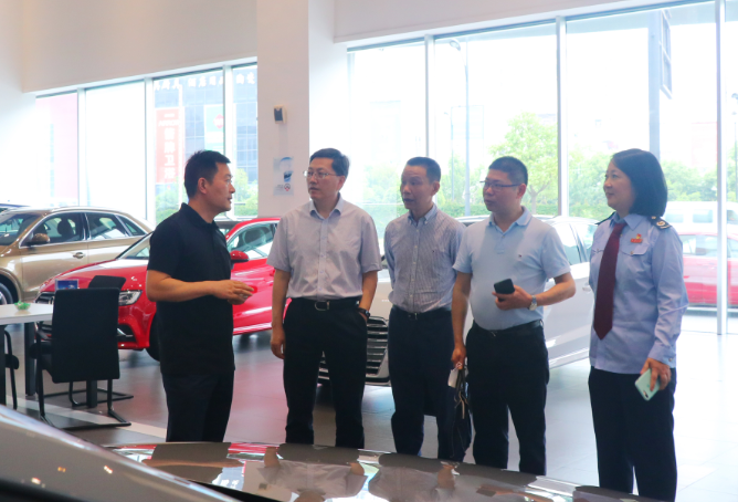 冯局长一行首先参观了新车及二手车展厅,莫总向冯局长等领导介绍了杭州德奥公司规模、经营业务等概况。走访中,冯局长重点了解了杭州德奥车辆购置税缴税点的运营情况,并实地对车辆购置税的缴税流程进行了现场模拟。