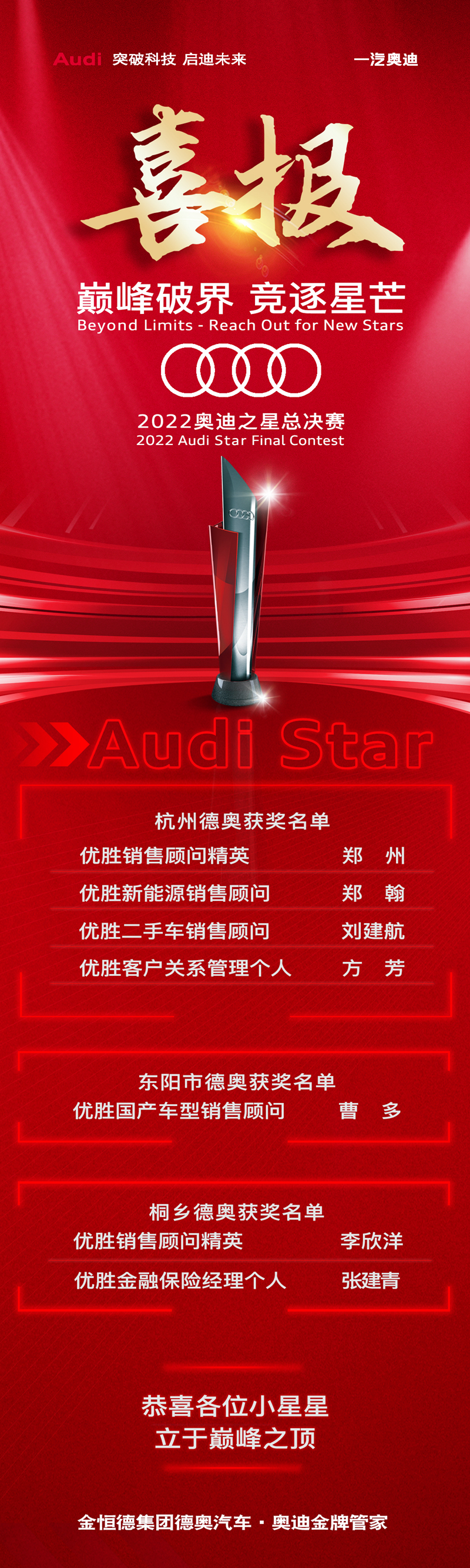 每一届奥迪之星竞赛是所有奋战在品牌一线的奥迪人追逐的目标与梦想。华亿(中国)集团汽车板块各店的精英骨干人员一路披荆斩棘,以竞赛促能力,开拓业务见识,学习优秀的工作技能与管理经验。通过全网精英选手们的角逐检核我们自身工作技能上的弱项与不足,从而 不断在实际工作中加以完善与提升。每年的奥迪品牌最高领奖台上,不断涌现华亿(中国)集团汽车板块奥迪精英们奋进的身影。“精益求精、追求极致”,是全体德奥人优秀的精神传承,奖杯、鲜花与掌声共同致敬每一位砺进的小伙伴!